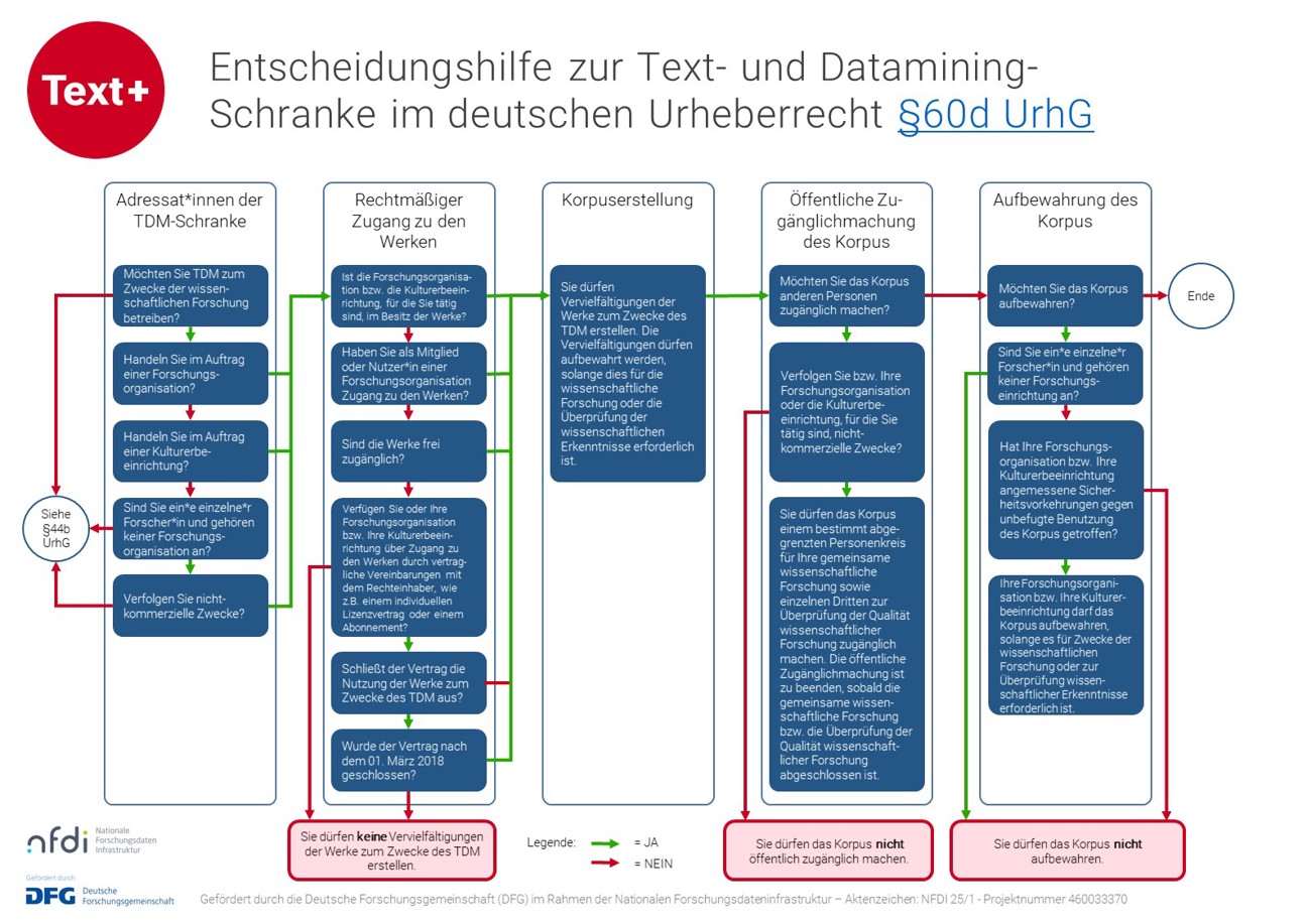 Für das Text- und Datamining (TDM) gibt es im deutschen Urheberrecht seit 2018 in §60d UrhG eine Schranke – also eine Ausnahmeregelung –, in der die Voraussetzungen beschrieben sind, unter denen Forschende TDM betreiben dürfen. Diese TDM-Schranke wurde 2021 novelliert, um die DSM-Richtlinie der Europäischen Union in deutsches Recht umzusetzen. Text+ hat dazu eine Publikation veröffentlicht (Assessment of the Impact of the DSM-Directive on Text+), begleitet von einer Handreichung, die als Entscheidungshilfe bei den wichtigsten Fragen zur TDM-Schranke dient.